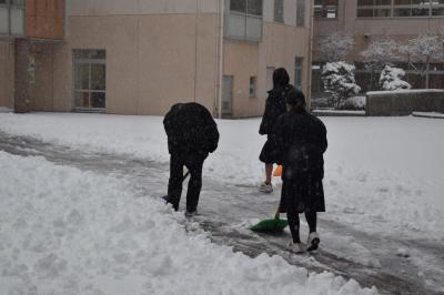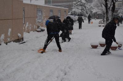 そこで、午前中に本校で練習予定だった陸上部と野球部の生徒が自主的に雪かきを始めていました。一人から始まった思いやりの輪が全体へと広がっていました。