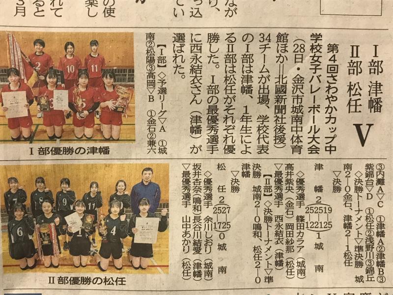 昨日28日(木)、さわやかカップ中学校女子バレーボール大会が行われ、本校女子バレーボール部が、学校代表のI部で優勝、1年生によるII部で3位と大いに奮闘してくれました。I部では、Aチームが予選リーグを1位で通過、決勝トーナメント準決勝、決勝をともに2ー1で制しての優勝でした。Bチームも予選リーグ2位と頑張りました。また、I部最優秀選手に西永結衣さんが、II部優秀選手に長谷川結愛さんが選出されました。