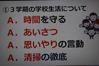 奥泉先生からは、3学期は新年度0学期であり、今年度の総まとめ+準備期間である。3学期の学校生活で、時間を守る・あいさつ・思いやりの言動・清掃の徹底をお願いしたいとの話がありました。