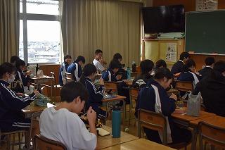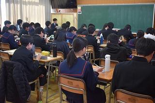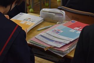 3学期は次の学年の0(ゼロ)学期。2年生は、来週から進路選択に向けての講座学習がスタートします。4限目の学活の時間はその準備でした。各自が選択した問題集、解説集、ファイルの配付、記名、講座学習の流れの確認が行われました。一日、数分間の努力の差が、最後に自分に返ってきます。しっかりと講座学習のスタートを切ろう!