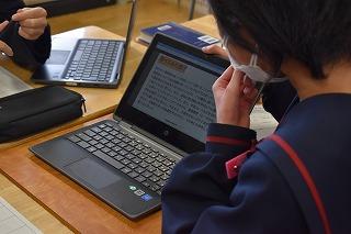 2年生国語科の授業。「読み手に伝わるように表現を工夫して、作品の魅力を文章にまとめよう」を課題に授業が進められていました。生徒の皆さんは、学習したことを生かしながら、作品を見て感じたこと、その理由(具体的に・わかりやすく・表現技法を使う)、まとめの構成で、有名な絵画作品をひとつ選択し、文章にまとめていました。学習した知識・技能を、別の場面あるいは別の課題において活用して解決できたときが、知識・技能が自分のものになったときといえそうですね。