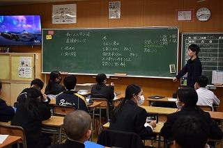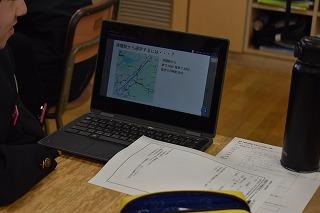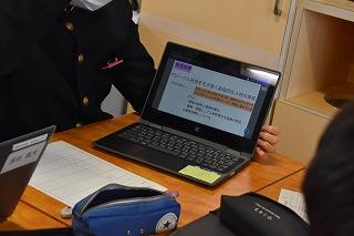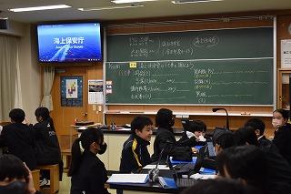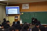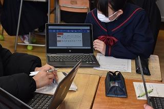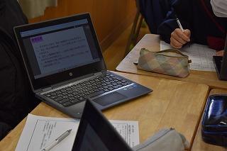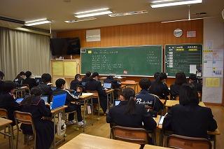 2年生、5限目総合的な学習の時間。各クラスで、高校調べのグループ発表会を行っていました。発表者は、クロームブックの画面を見せながら、各自が調べた高校の教育目標や特色などについて説明、聞き手は、メモを取りながら説明を聞きました。特色等をわかりやすくまとめる工夫や聞き手を意識した発表が見られました。聞き手からの質問やプレゼンに対しアドバイスする様子も見られました。こうしたやりとりが、さらなる改善へとつながるのですね。