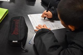 1年生数学科の授業。現在、空間図形について学習中のようです。今日の授業では、投影図は、「真上」から見た図(平面図)と、「真正面」から見た図(立面図)で表す方法であることを確認し、例題にチャレンジしていました。例えば、立面図が正方形、平面図も正方形だと、もとの立体はサイコロの形(立方体)だとわかります。