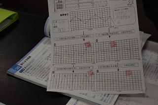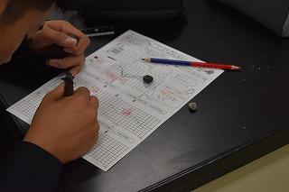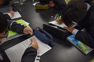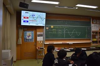 1年生理科の授業。今日は「音を波形で表して比べてみよう」を課題に、授業が進められていました。まずは既習事項の『音の高さは「振動数」で決まる、音の大きさは「振幅」で決まる』を確認しました。その後は、基準音①(写真参照)を基に、「①の音の高さを2倍高くし、大きさは同じ」、「①の音の高さを変えずに、大きさを半分」、「②の音の高さは変えずに、大きさを2倍」、「②の音の高さを2倍低くし、大きさは同じ」の4つの波形を表現していました。とっても意欲的な学びの姿でした。