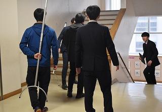 生徒玄関より不審者が侵入し2階多目的ホール付近で職員が発見という想定で実施しました。不審者発見から警察への通報、チャイム・放送による授業者及び生徒への周知の流れ、不審者確保までの教職員の対応、教室で安全確保に努める子ども達の様子などについて、観察いただきました。