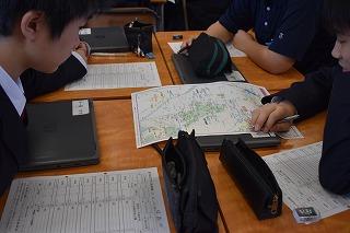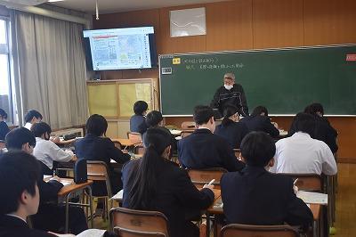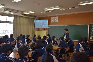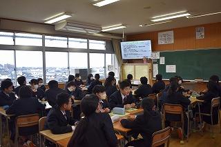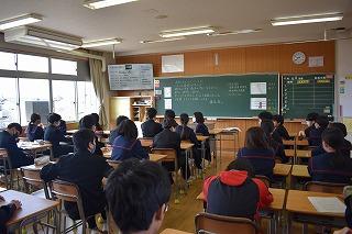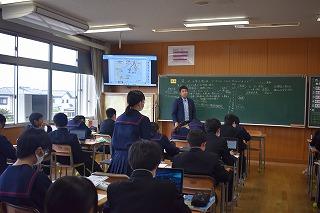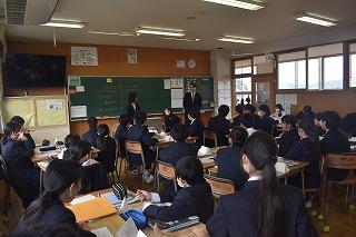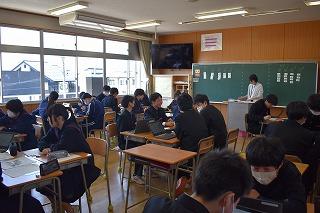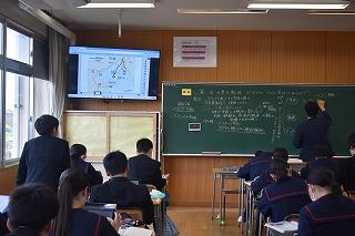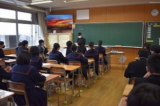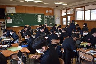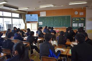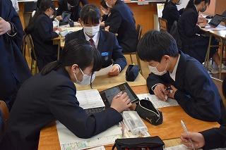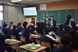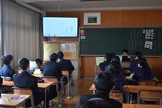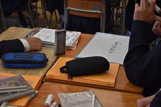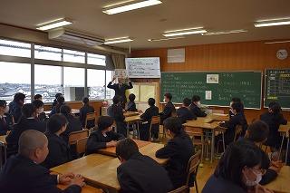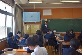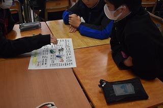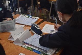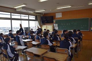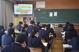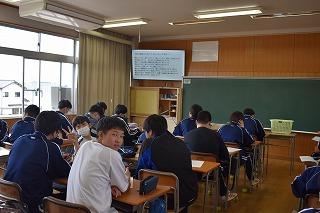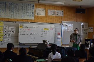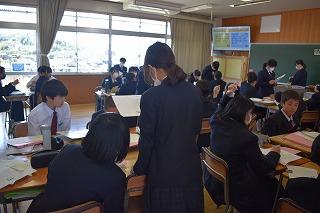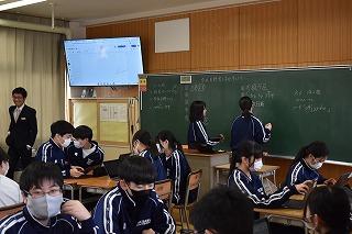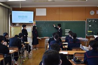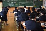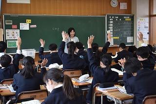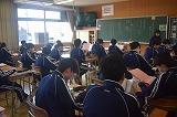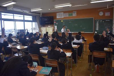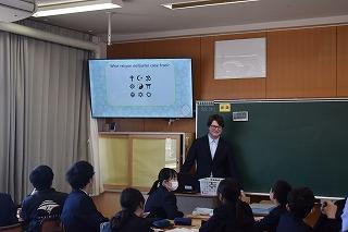 2年生英語科の授業。今日はALTのアンジェロ先生と一緒の授業、グループに分かれ、アンジェロ先生の出題するクイズに、グループで協力しながら答えました。易しいものから頭をひねる難しいものまで、バラエティに富んだ出題でした。