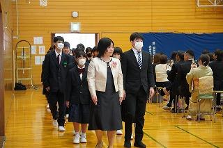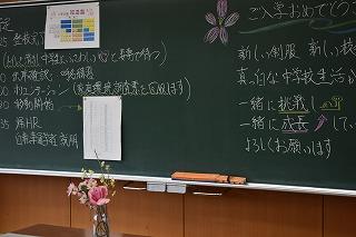 新入生の皆さん、今日はお疲れさまでした。入学式、とっても素敵でした。緊張もあり疲れたことと思います。慌てず、焦らず、中学校生活に慣れていってください。不安に思うこと、困ったことがあれば、「助けて」と周りの人に声に出してください。必ず力になります。明日、皆さんに会えることを楽しみにしています。