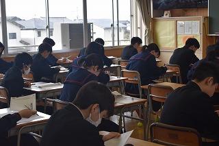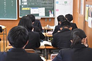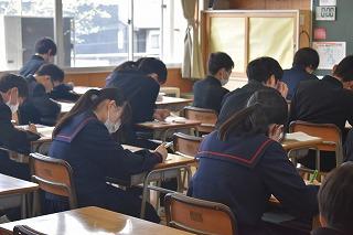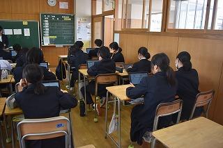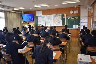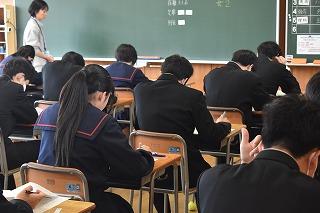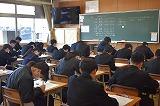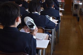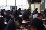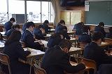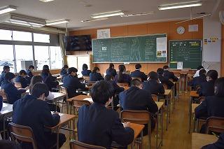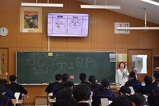 3年生美術科の授業。これから自画像制作に取り組んでいくようです。今日はその前段階、基本形の練習です。モニターに映し出された先生の描き方を参考に、「正面」、「斜め横」、「下から」、「上から」の描き方を練習しました。どんな自画像が完成するのか楽しみです。
