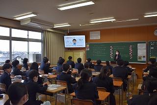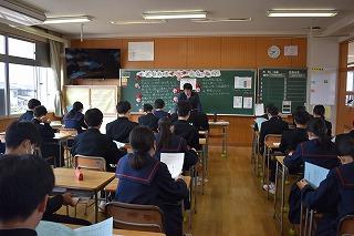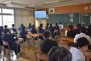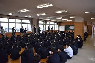 1限目の時間帯に、対面式、全校集会を行いました。対面式では、生徒会役員の皆さんが、中学での学習、給食、清掃、津幡中いじめ三原則、専門委員会等について、スライドを使って大変分かりやすく1年生に伝えてくれました。最後に、在校生を代表して、生徒会執行部の多賀啓仁さんが、歓迎の言葉を述べてくれました。生徒会執行部の皆さん、ありがとうございました。
