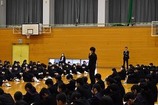 続いて、全校集会を行いました。はじめに校長から、生徒の皆さんに大切にしてほしい、身に付けてほしい5つのことについて話しました。