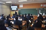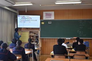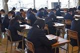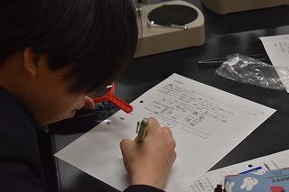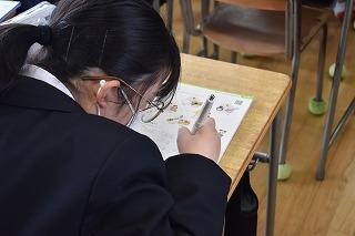 3年生理科の授業。3年生も顕微鏡を使っての学習中。タマネギやネギの種子が発芽した根を使って、細胞分裂が盛んにおこなわれているところの細胞を観察していました。1年生同様、夢中でレンズを覗き、細胞分裂の様子を観察している姿は大変素敵でした。