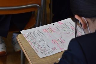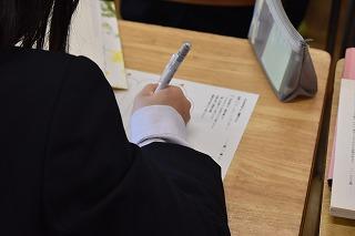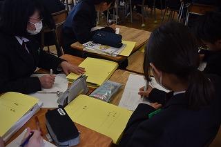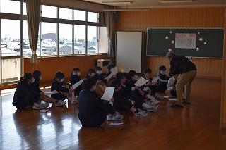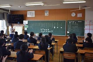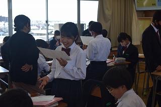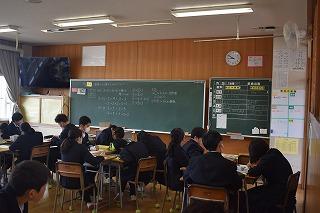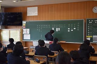 1年生国語科の授業。中学1年生の国語で最初に学習するのは、工藤直子さんの詩「野原はうたう」です。1年生は今週、各クラスで音読発表会をしていました。各グループで、詩の主人公の気持ち、年齢、性格などを設定し、それらが表現できるように練習を重ねていました。いくつかのクラスの発表場面を見ましたが、どのグループの発表も表現の工夫がはっきりと聴き手の皆さんに伝わっていましたよ。