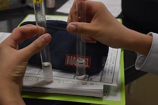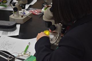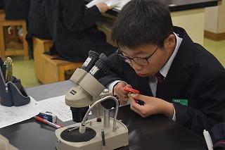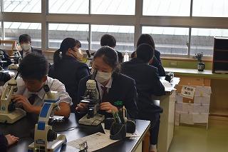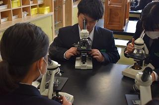 1年生理科の授業。顕微鏡の使い方を学習中です。使い方の手順を確認し、実際にやってみます。「あっ、見えた」、夢中でレンズを覗く姿が教室にありました。
