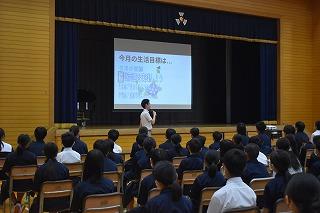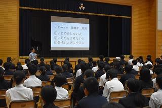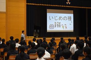 生活担当の千木先生からは、「いじめの種・・・いじめにつながる行動。どこでも存在し、仲が良くても芽を出す」についての話がありました。ちょっと立ち止まって、自分の行動、言動を見つめ直してみましょう。