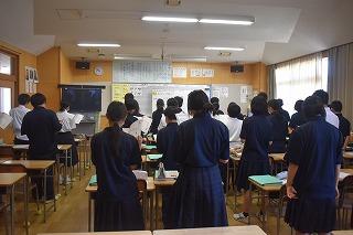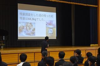 生徒会タイムは、給食委員会から「残量調査」の結果報告がありました。調理師、調理員、栄養職員の皆さんが、生徒の皆さんの栄養バランスを考え、栄養満点で美味しい給食を毎日作ってくれています。それぞれの適量をしっかりと食し、健康な体作りにつなげていきましょう。
