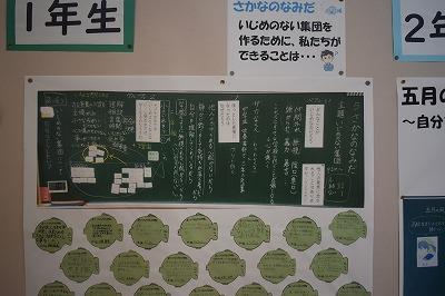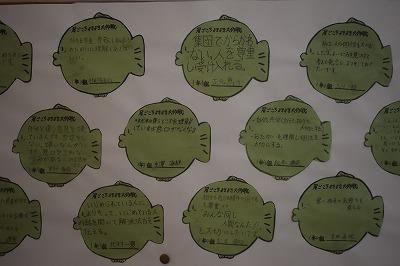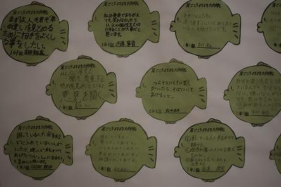 1年生は前回の道徳の時間に、教材「さかなのなみだ」を通して、いじめのない集団について考えました。いじめのない集団をつくるために、『居心地よきよき大作戦』ということで、ひとりひとりが書いた「心掛ける行動・大切にすること」で、大きなさかなが描かれました。「居心地のよい学年・学級」のために、今一度自分自身の学校生活を振り返るよい機会ですね。