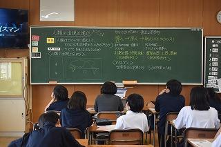 1年生理科の授業。今日は脊椎動物の特徴についての発表会を行っていました。各班が哺乳類、鳥類、は虫類、両生類、魚類のどれかを担当し、前時までに、協力してプレゼンをまとめました。発表班は生活の場所・体表の様子・体温・増やし方(卵を産む)・呼吸の仕方・目玉情報について伝え、聞き手はそれぞれの特徴をシートにメモしました。話し手と聴き手が、それそれの大切なポイントをしっかりと意識した発表場面でした。