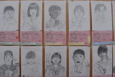 さて、美術室前廊下の掲示板に3年生が描いた自画像デッサンが展示されています。鏡を見て、表情・ポーズを生かし、顔のTラインや全体のバランスと明暗に配慮しながら、丁寧に表現しました。「表情豊かな自画像」が並んでいます。