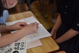 3年生道徳科の授業。教材は「違うんだよ、健司」。教材の内容にもある通り、間違いだとわかっていても友達に同調する姿や、忠告してうとましく思われる(いじっかしがられる)姿は、現実にもよくある場面。しかし、そう思われても親友のことが心配で行動を起こす健司の内面のよさに気付き、心の葛藤を打ち明けた友人の姿、本当の友情の意味を考え始めた主人公「僕」の姿から、本当の友情について考えました。「真の友情」とはどういうものか?、本当に難しいものですね。これが真の友情だという正解はないのかもしれません。ただ、相手に対して、「笑顔でいること」「相手の話に興味を持って耳を傾けて聴くこと」「思いやりを持って相手に温かい言葉をかけること」、この3つは今すぐあなたが与えることができることです。