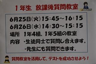 本日放課後、1年生は、1学期期末テストに向けて「質問教室」を行っていました。友達に説明して理解してもらうことは、自分自身の学習内容の定着に、とっても役に立つことですね。質問教室は明日も実施されます。2、3年生も昨日に引き続き、質問教室、自習教室を実施しました。