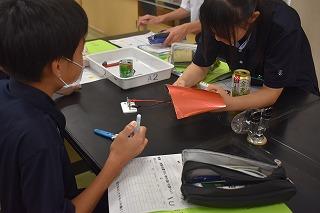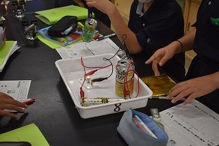 1年生理科の授業。理科用語の物体と物質の違いについて確認し、金属と金属でない物の違いを調べていました。電気を通すか、磁石につくかの2つの方法で確かめていました。さて、ペットボトル、スチールウール、ハサミ(切るところ)、アルミ缶、スチール缶、割りばし、ガラス棒、シャープペンシルの芯、折り紙(表)、折り紙(裏)のうちで、金属はいくつあるでしょうか?