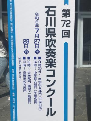 本日、石川県吹奏楽コンクール中学生A部門が、金沢歌劇座にて開催されました。本校吹奏楽部は、コンクールのトップを切って登場し、課題曲「メルヘン」と自由曲「「秘儀Ⅳ〈行進〉」を披露しました。