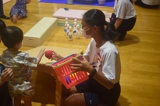 「親子支援センター夏まつり」に、中村心優さん(2年)、中山真奈さん(2年)、寺田桜生さん(1年)が、津幡南中学校の生徒の皆さんと一緒に、活動していました。中村さんと中山さんは、「コロコロゲーム」を担当。幼児に優しく声を掛けながらボールを渡したり、倒れたピンをていねいに直したり、そしてピンが倒れると、拍手して幼児、お母さんと一緒に喜んだりと、学校とはまた別の、2人の素敵な一面を見ることができました。