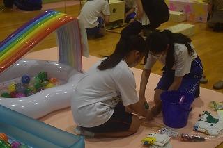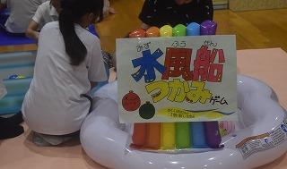 寺田さんは、南中の生徒さんと一緒に、水風船つかみを担当。風船に空気を入れて手早く準備したり、やさしい笑顔で幼児に語りかけたり、やさしい表情で、幼児の水風船つかみの様子を見守っていました。寺田さんは、朝の登校時、いつも笑顔でさわやかに、「おはようございます」と私にあいさつしてくれます。そんないつもと変わらない素敵な姿でした。