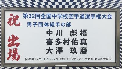 同じく学校外で活動している中川彪梧さん(2年)、喜多村佑真さん(2年)、大澤玖磨さん(1年)が、全国中学生空手道選手権大会の団体組手に出場します。中川彪梧さんは個人形にも出場します。大会での健闘を祈ります。