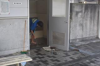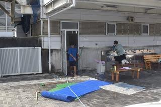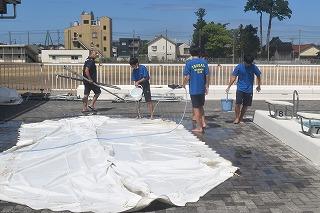 今週末の24日(土)に、河北郡市水泳大会が、本校プールを使用して行われます。今日は、水泳部員の皆さんが、トイレ、更衣室の清掃、テント設営などの準備に励んでいました。
