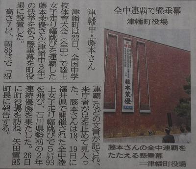 先の全国中学校体育大会で陸上女子走り幅跳びを連覇した藤本茉優さん(3年)の快挙を祝う懸垂幕が津幡町役場に設置されました。26日(月)に津幡町役場を訪問し、矢田富郎町長に優勝報告をします。
