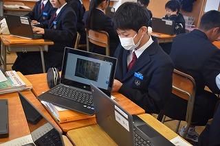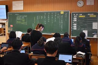 3年生国語科の授業。最古の和歌集「万葉集」、勅撰和歌集「古今和歌集」、「新古今和歌集」を学習し、その中から自分が選んだ和歌を説明するスライド制作に取り組んでいました。説明スライドには、①現代語訳②作者について③表現技法④和歌への評価(魅力・よさ・表現のうまさ)を盛り込みます。完成が楽しみです。