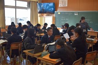 1年生理科の授業。大型モニターにはカワセミの画像、今日はカワセミの生態についての学習?