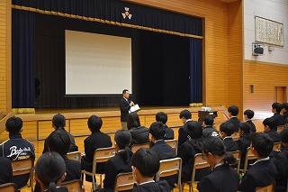 角藤弁護士は本校出身です。松本教頭先生が中学2年生の時の担任だったそうです。終わりに、後輩である生徒の皆さんに、以下のように伝えて話を締めくくりました。『今の時代、どんどん新しい技術が生まれ、生活が益々便利になっています。ただ、意識していないと、その新しい技術を使う立場からその技術に使われる立場に陥り、さらには、それに翻弄されて人生を棒に振ってしまう可能性すらあります。紙は燃やしてしまえばなくなりますが、インターネット上に流されたデジタルデータをすべて消し去ることはできません。一度失った時間を取り戻すことはできません。一度きりの人生を謳歌するために、知り、考え、そして、大いに学びましょう。』