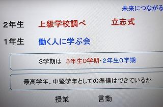 各クラスリーダーからの2学期の振り返り、学年主任の上谷先生のお話の様子。2学期の成果と課題を3学期につなげていこうとする各リーダーの話はお見事でした。