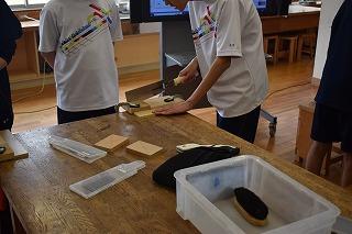 1年生技術家庭科技術分野の授業。木片の切断に入っています。最初は少しぎこちなかったのこぎりの動きもスムーズになり、木片を切る「ギーコ、ギーコ」という音がリズミカルに聞こえてくるようになってきました。
