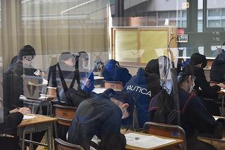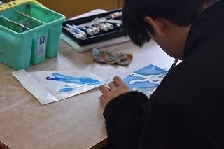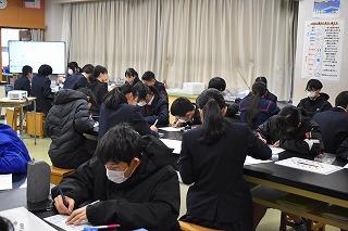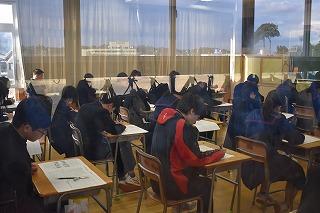 3年生美術科の授業。この時期恒例?!の絵馬づくりに取り組んでいます。願い事はやはり、それぞれの進学先に『合格できますように』が多いようです。各クラスの絵馬が完成したら、多目的ホールに飾られます。