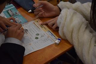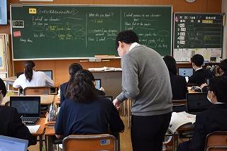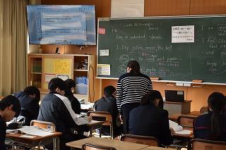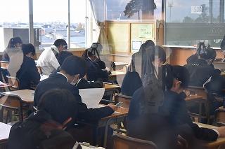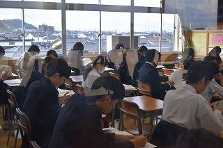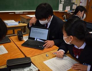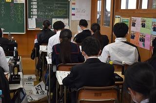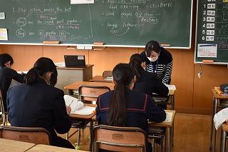 2年生英語科の授業。本文内容の理解に取り組んでいました。ポイントとなる表現等を確認し、ワークシートで自身の内容理解度を確認していました。英語4技能のひとつ『読むこと』では、日常的な話題や社会的な話題についてかかれた文章を読んで、①必要な情報を読み取る、②文章の概要を捉える、③文章の要点を捉える、という力を身に付けることが目標となります。①~③を的確に捉えるためには、やはりコツ(ポイント)があります。授業を大切にして、しっかりと身に付けていってください。