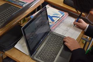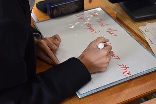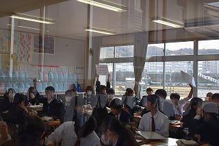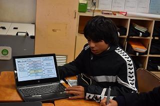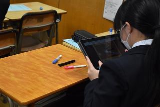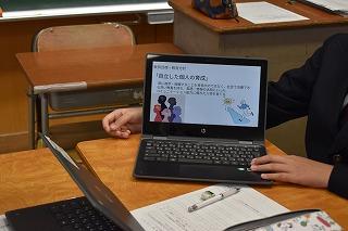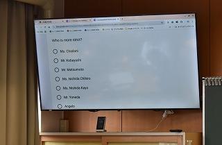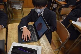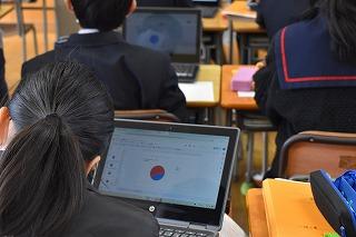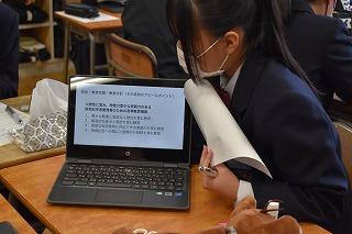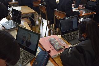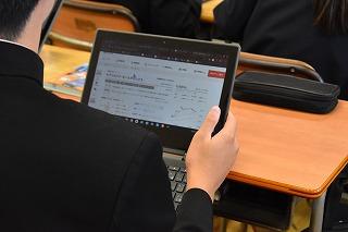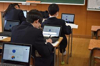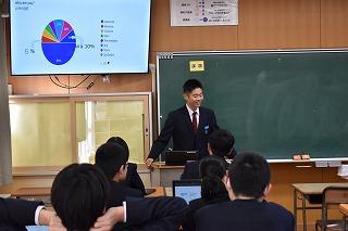 2年生英語科の授業。自分が選択したトピックについて調査した結果を発表していました。興味深いトピック、調査結果を適切に伝える図表やグラフの選択、モニターを指し示しながら、そして聞き手の反応を確かめながら、表情豊かに発表する素敵な場面に出会うことができました。