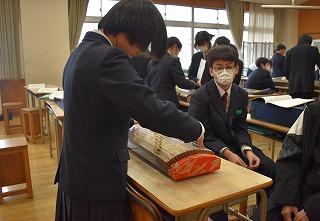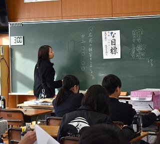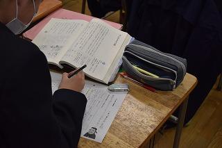 2年生国語科の授業。「書初め」の練習に取り組んでいました。2年生は『新たな目標』です。ピンと張りつめた空気感の中、黙々と半紙に向き合う生徒の皆さんの姿が、そこにありました。