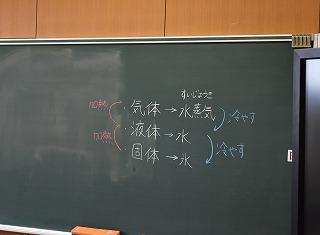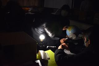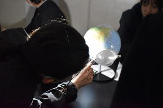 3年生理科の授業。カーテンが引かれ暗い理科室。しかし生徒たちの声が聞こえるので、そっと扉を開けて中に入りました。3年生は現在、天体について学習中。今日は「観測地によって太陽の日周運動はどうなるのか」を課題に授業が進められました。既習の南中、南中高度を確認、北極付近、赤道、オーストラリアなどの各地点での太陽の日周運動を予想、模型を使いながら予想を確かめました。理科の「天体分野」が苦手だった記憶が蘇ってきました。地球や太陽といった天体の動きをうまくイメージできなかったせいですね。