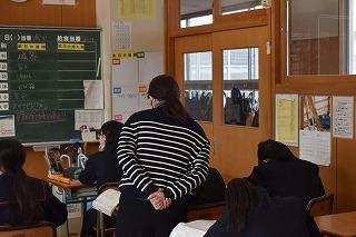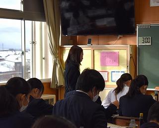 授業担当者は久田先生でした。今年度から津幡中学校の仲間に加わっていただいた先生です。異動して早々、3年2組の担任、そして3年生の皆さんにとって一番大切な進路選択についてのまとめの業務を担当し、大変忙しい日々を過ごしています。そのような中でも、女子バスケットボール部の顧問として、毎日体育館に足を運び練習を見守ってくれています。