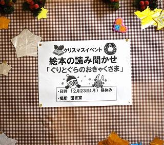図書委員2名が読んでくれたのは、『ぐりとぐらのおきゃくさま』でした。かわいらしいお話とほっこりした内容は、クリスマスにピッタリでした。イベントに参加した生徒の皆さんには、素敵なプレゼントもありました。