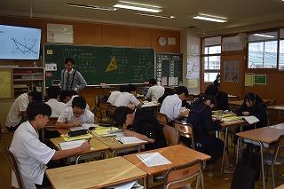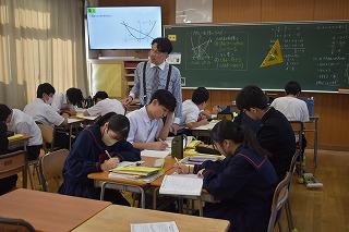 3年生数学科の授業。グラフ内に示された三角形の面積を求める演習に取り組んでいました。4人グループになり問題にチャレンジ。グループといえ自力で解決を試みる人、途中で少しつまずいて他のメンバーに聞いている人など様々、先週の校内研修会での講師の方からの言葉、「個人作業の共同化」を実感した授業の様子でした。