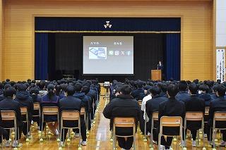 角藤弁護士は本校出身です。松本教頭先生が中学2年生の時の担任だったそうです。終わりに、後輩である生徒の皆さんに、以下のように伝えて話を締めくくりました。『今の時代、どんどん新しい技術が生まれ、生活が益々便利になっています。ただ、意識していないと、その新しい技術を使う立場からその技術に使われる立場に陥り、さらには、それに翻弄されて人生を棒に振ってしまう可能性すらあります。紙は燃やしてしまえばなくなりますが、インターネット上に流されたデジタルデータをすべて消し去ることはできません。一度失った時間を取り戻すことはできません。一度きりの人生を謳歌するために、知り、考え、そして、大いに学びましょう。』