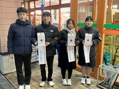 本日16時頃より、Aコープ津幡店入り口において、津幡町赤十字奉仕団の皆様と本校JRCメンバー(生徒会執行部)とで、街頭募金を行いました。厳しい寒さの中、本校JRCメンバーは、素敵な笑顔でお店を訪れる方々に募金の協力を呼びかけていました。