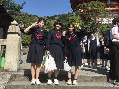 各グループ、それぞれのプランに従って自主プランを大いに満喫したようです。集合場所の清水寺に、みんな大満足の笑顔で到着しました。清水寺は修学旅行生と観光客で大混雑でした。お世話いただきましたタクシー運転手の皆様方、今日は本当にありがとうございました。各グループでの清水寺散策後、16時30分に宿泊ホテルに向けて出発します。