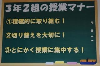 1日の全校集会で、各学級で話し合って決定した「授業マナー」を一部紹介し、話をしました。学習規律(授業のルールやマナー)は、学校という学び場において、生徒の皆さん一人一人が安全に安心して学ぶためにあるものです。「一人一人の学びやすさ」のためのものです。皆さんは、これからの社会を生き抜くために必要な知識・技能、思考力・判断力・表現力を各教科等の学びを通して、身に付けなければなりません。と同時に、一人一人の学ぶ権利にも配慮しなければなりません。新学期がスタートし、大きく成長した姿を見せてくれている皆さんです。ぜひ、「一人一人が安心して学べる場」をこれからも継続していきましょう。
