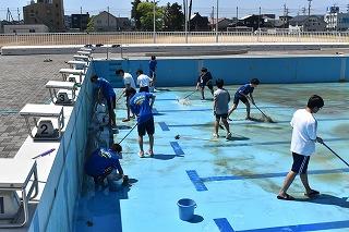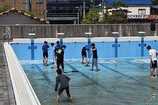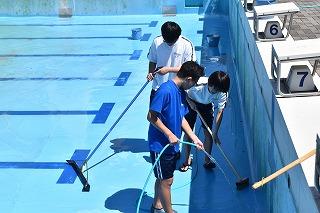 本日午後から、水泳部の皆さんがプールを掃除しました。使用オフの期間にプールの底にたまっていた泥や壁面の汚れを、きれいに落としました。水泳部の皆さん、顧問の西田千優先生、コーチ、大変お疲れ様でした。このプールでの今年度の初泳ぎも近いですね。