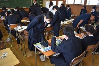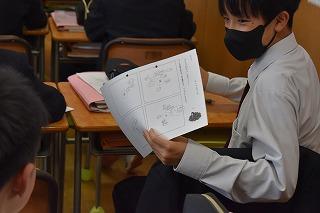 おおぞら学級での英語科の授業。「津幡中のお気に入りの場所はどこ?」を課題に、I like ~.の表現などを使って、相手に伝えていました。